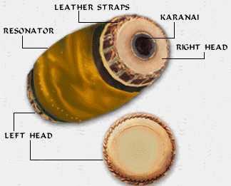 Construction: The mridangam that is used today is made of a single block of wood that has been hollowed out. The wood used is either jack wood or redwood. It is a double-headed drum, shaped like a barrel. The two heads are connected by means of leather straps that run along the sides of the body. There are small cylindrical pieces of wood called pullu, placed between the wooden shell and the leather straps. By moving the pullu, the pitch can be changed. The right head, which is smaller than the left head, is made up of three concentric layers of skin. The innermost layer is not visible. The outer layer, usually made up of calf hide, is called the meettu tol and the inner ring, made up of sheepskin, is called the chapu tol. At the centre of the right head is a black spot, called the choru. This is a permanent spot made of a mixture of cooked rice, manganese and iron filings. This is what gives the mridangam its special tone. The left head, known as the toppi, is made up of only two layers of skin. The inner layer is made of sheepskin while the outer is made of buffalo hide. Before playing, the performer applies a thick paste of semolina or cream of wheat to the centre of the left head. This is done to lower the pitch and give the mridangam a bass sound. |