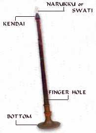 The Ottu, a drone instrument, is a part of the Nagaswaram ensemble. It is similar to the Nagaswaram in shape and structure, but is slightly longer. However, it has only one finger-hole to produce the desired note. At the upper end of the instrument there is a reed into which, the player blows. |